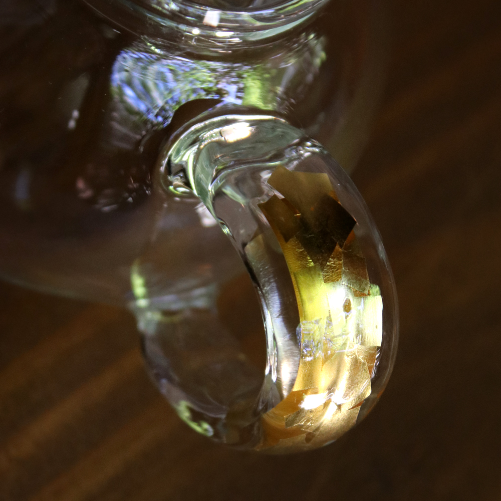 渡邊徳明さんの人気シリーズ「ひびき」、金箔を層にして耐熱ガラスの中に閉じ込めています。このポットは取手の部分に2層金箔(24k)が散らされており、金箔同士が輝きあって、鮮やかで温かみのある光を放っています。特別に透明度の高いガラス越しに見える茶葉の色と動きも美しく、注ぎ口から水が一切垂れないキレの良さも大きな魅力です。