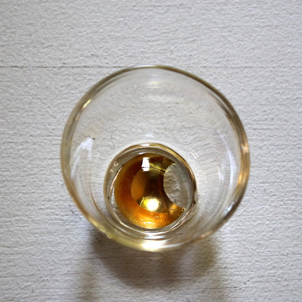 渡邊徳明さんの人気シリーズ「ひびき」、金箔を層にして耐熱ガラスの中に閉じ込めています。この杯は底の部分に2層の三日月型の金箔が入っており、金箔同士が輝きあって、鮮やかで温かみのある光を放っています。厚めの耐熱ガラスで割れにくく、欠けにくく作られておりますので、末長くお楽しみいただけます。