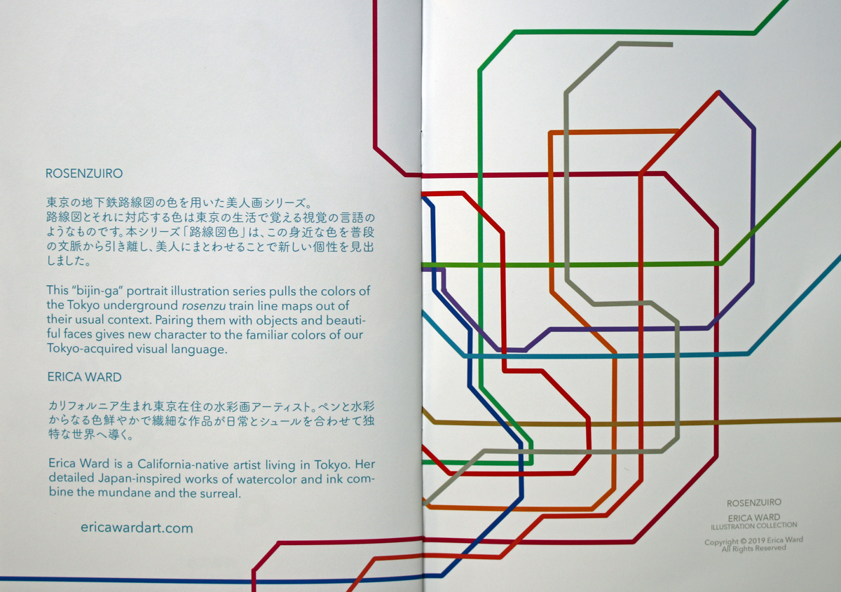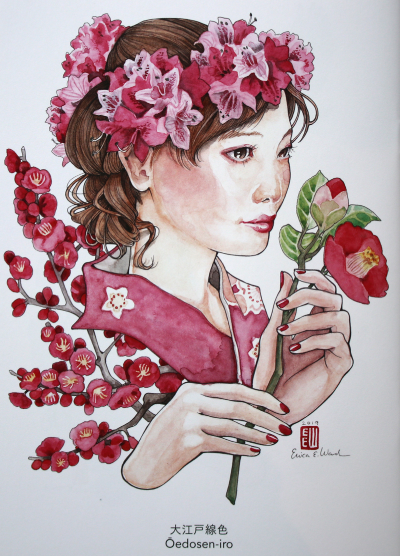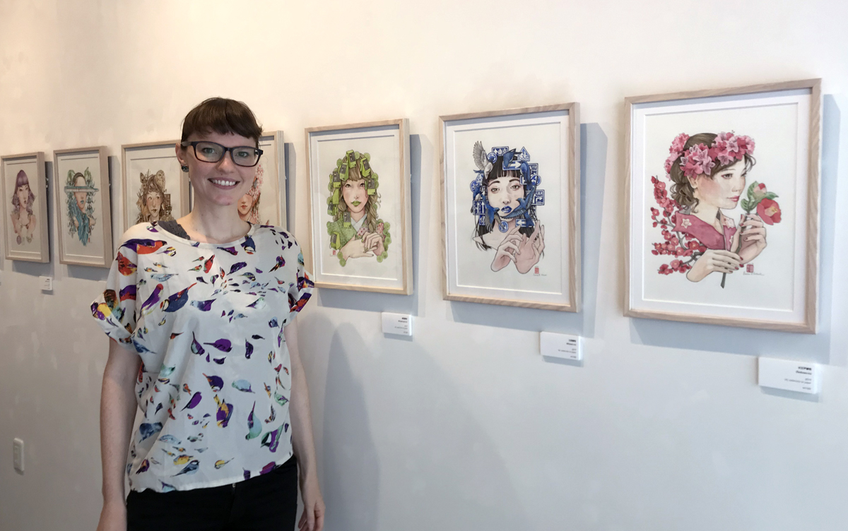 浮世絵やアールヌーヴォーにインスパイアされたスタイルで、ペンのはっきりした輪郭と水彩の優しい色で美人画を描く。