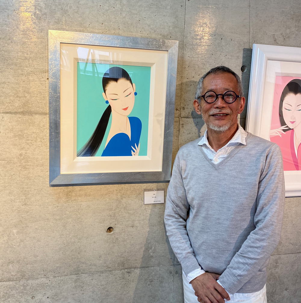 幼少の頃から絵を描くのが好きだった彼は、高校を卒業後、多摩美術大学グラフィックデザイン科へ進み、イラストレーターを目指す。時代の波に乗り西洋文化に影響を受け、写実的な作品を描いていく中で、自分が「日本人である」という意識が芽生え次第に淋派、弥勒菩薩をはじめとする仏教美術等、日本独自の美意識へと傾倒していった。彼の描き出す美人画は、まさにアールデコのヨーロッパ的要素と自分の中の日本的なものが見事に融合し、たおやかで華やかな世界を創りあげている。1987年にはノエビア化粧品の広告に抜擢され、CMアートの先駆者として人気を博し、彼の作品の中の女性たちは多くの人々を魅了し続けている。「私は私自身のミューズ(女神)を描きたいと思っている。」と言うように、それは彼の永遠のテーマであり、作家活動の原点ともいえる。