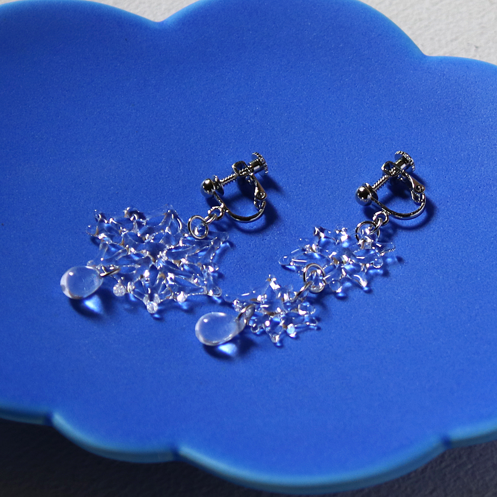 ガラス作家・齋藤直さんの独特のランプワークの技術(ストリンガーワーク)を駆使したを雪の結晶をモチーフにしたイヤリング(ピアスにも交換可)2色のご紹介です。