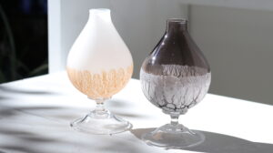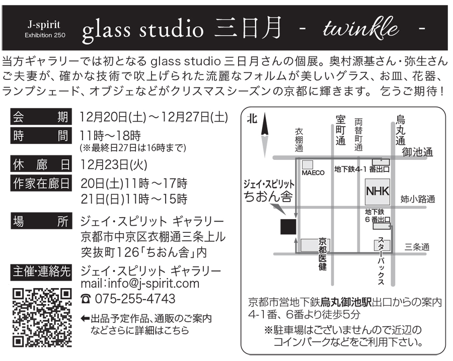 当方ギャラリーでは初となるglass studio三日月さんの個展。奥村源基さん・弥生さんご夫妻が、確かな技術で吹上げられた流麗なフォルムが美しいグラス、お皿、花器、ランプシェード、オブジェなどがクリスマスシーズンの京都に輝きます。乞うご期待!