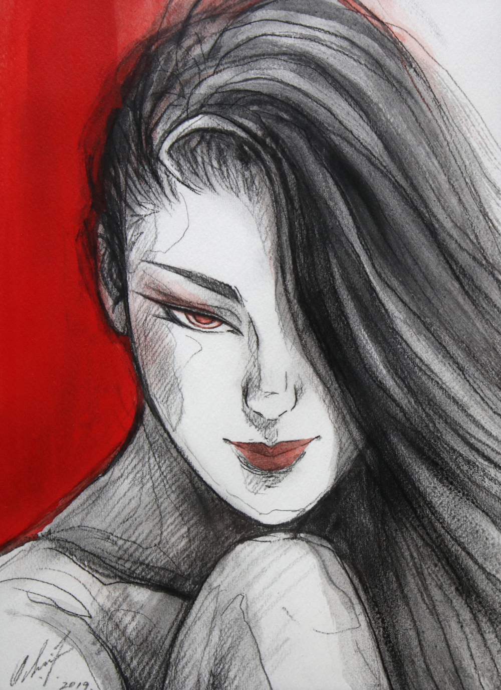 墨絵のようなタッチで描かれたドローイングタイプの作品です。タイトル通り女性ならではの激しい情念を感じさせる作品です。