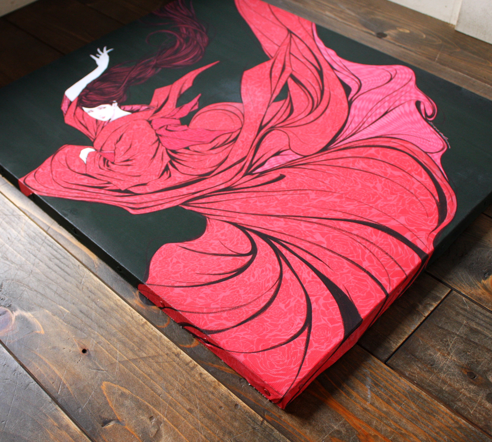 宮川さんはイラストレーターとして書籍のカバーや挿絵など既に多数の実績がございますが、それらはペンタブと描画ソフトを使い直接PC上で絵を描いて完成させます。そしてデータ画像として出版社に納品された物が書籍に使われるのが通常のプロセスです。ということで、肉筆原画は普通は存在しないのですが、お客様のオーダーで「熟蜜」(作:川奈まり子/竹書房文庫)のカバーに使われた絵を肉筆で描き起こし、作品化されました。美しく、繊細、そしてエロチシズムも溢れる秀作です。
